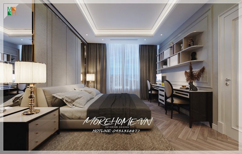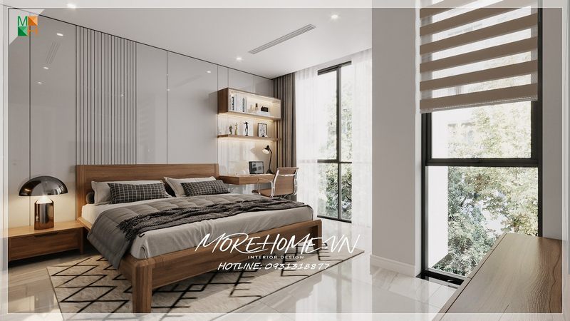 Phòng ngủ được thiết kế mẫu bàn bằng gỗ có diện tích dài vừa là nơi làm việc mà còn vừa là nơi ngồi đọc sách, thư giãn với sự kết hợp trên cũng đã tạo cho không gian phòng ngủ không bị trật trội và bí bách trong không gian.