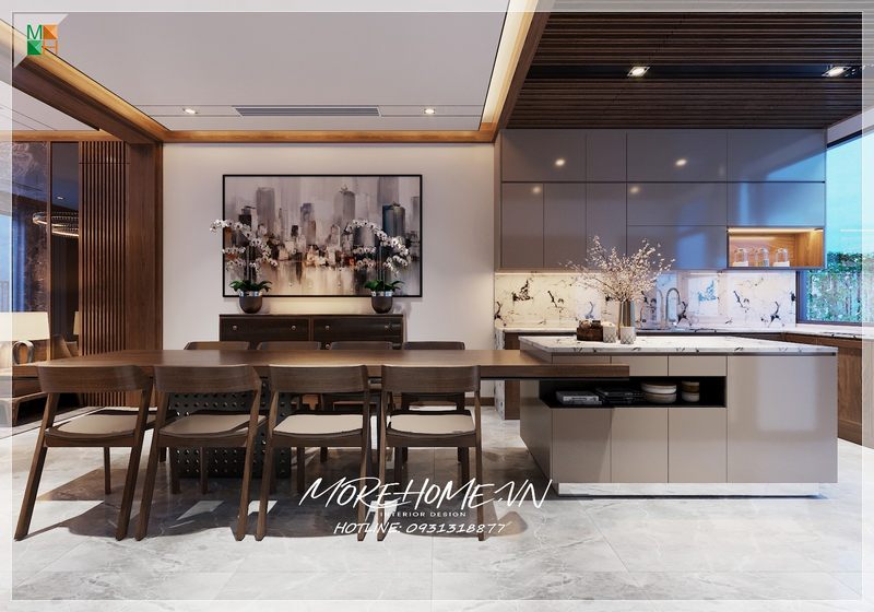 Bộ bàn ăn 8 ghế gỗ óc chó tiện nghi và không gian sống sang trọng được trang trí theo phong cách hiện đại. Các kiến trúc sư Morehome lên ý tưởng thiết kế mặt bàn ăn liền với bàn đảo tạo nên điểm nhấn khác lạ cho phòng.