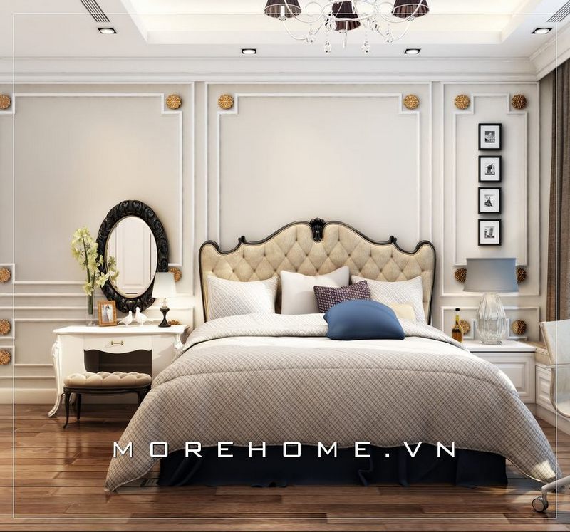 Nội thất Morehome đã thi công một giường ngủ gỗ tự nhiên phong cách Indochine với các chi tiết sắc nét và tinh tế, tạo nên một không gian thẩm mỹ cao cùng với sự nghỉ ngơi thoải mái cho gia chủ.