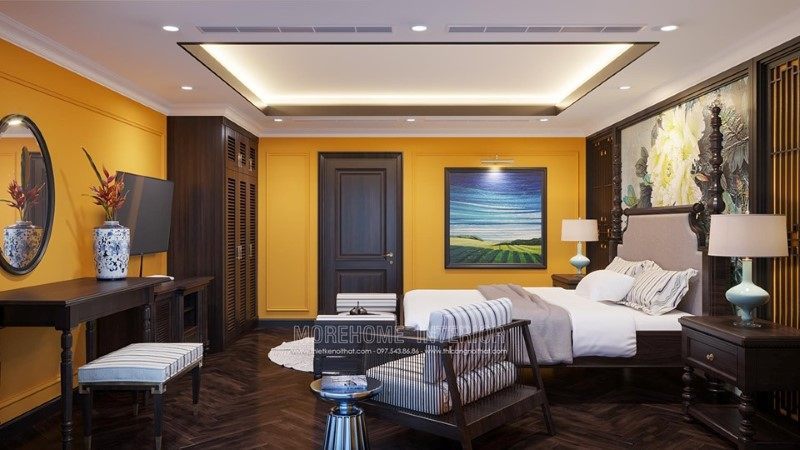 Thi công phong ngủ nội thất mang phong cách indochine mang tới một không gian riêng thoải mái, tiện nghi và tính thẩm mỹ cao