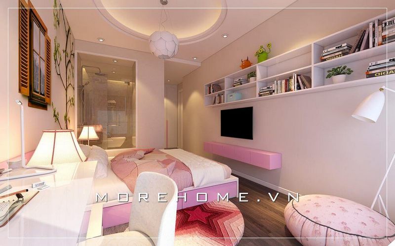 Mẫu giường ngủ gỗ với tông màu hồng hiện đại sẽ làm nên điểm nhấn cho căn phòng của bé gái.