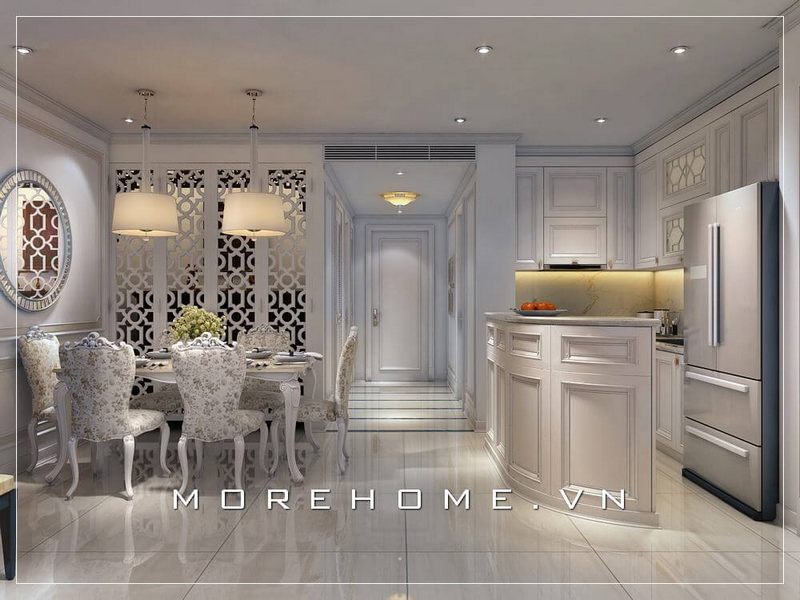 Thiết kế nội thất phòng bếp nhỏ theo phong cách tân cổ điển tinh tế, sang trọng và tiện lợi.